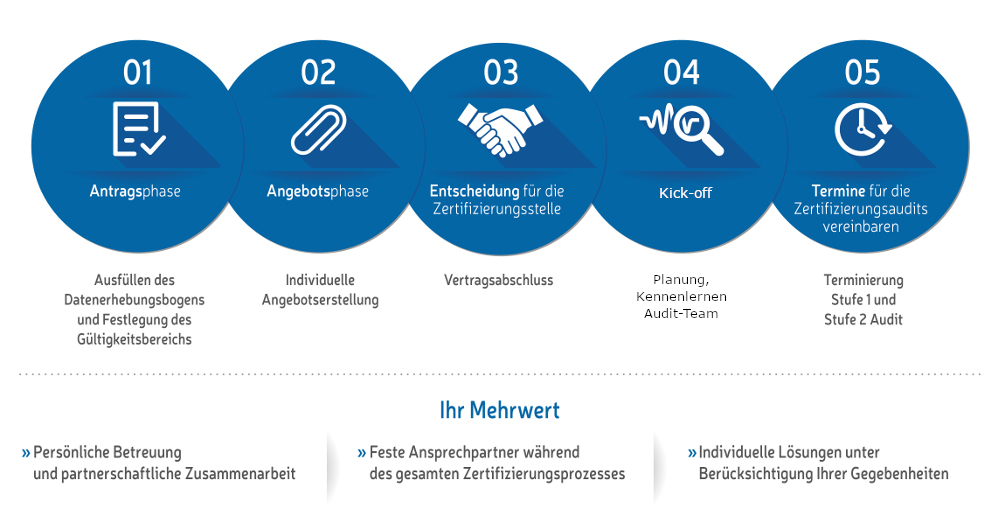 Die nachfolgende Grafik gibt Ihnen einen Überblick über unsere Vorgehensweise von der Angebotserstellung bis zur Vereinbarung des Zertifizierungstermins.